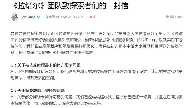 在饱受争议之后,《拉结尔》官方微博于9月27日发出了《致玩家的一封信》,列举了近期最受关注的一系列问题并做出了回应。其中最让人惊讶的是,《拉结尔》的体力系统将会被取消。