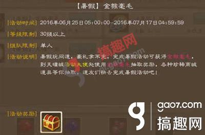 玩家完成暑假活动,可以获得金猴好卖。到天墉城活动大使处可以使用金猴毫毛抽取奖励,2根毫毛可以抽一次,有机会抽到各种商城道具哦。