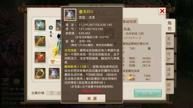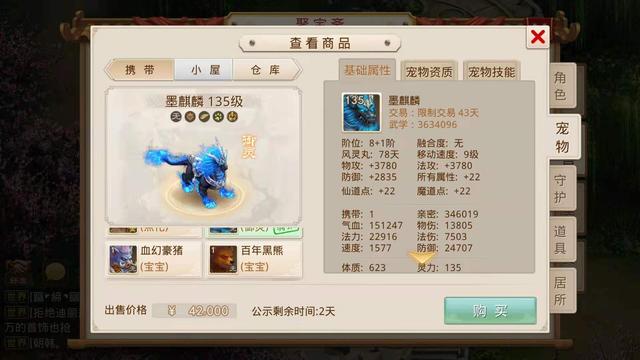 这就是这个号的全部内容了,总的来说,这个号单变异+单神兽,而且道行和宠物武学也在区里面低不少,光看这个方面比起前面看过的角色4.2万还是有点虚高的,但是考虑到这是个几十条线的大区,人比起红尘,铁马应该要多不少的,所以区组还有点加成,所以这个号要是有道友想要,去砍砍价,低个几千块顶多了,拿下了还是可以的。
