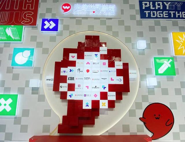 在N2场馆中,完美世界游戏展台面积占比不小,舞台正面上方是完美世界游戏的Logo——一颗逗号,中间由像素风的两颗心形组成字母“W”,配色回归“完美红”。今年4月,完美世界游戏进行品牌升级,启用此 Logo 时,逗号中间的“W”被解读为他们与玩家心心相连,永远与用户玩在一起的游戏初心。