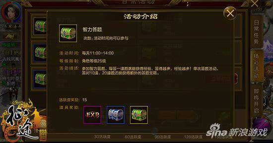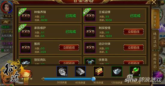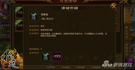 在20级之后“侠客岛”、“家族BOSS”、“家族降妖”日常任务也随之开启。其中,侠客岛是勇士一展身手的比武之地。具有两奖励机制,累计击杀30人以及增加侠客岛排行榜。累计击杀30人领取专属的装备箱;获得侠客岛排行榜前三名的玩家可以获得称号奖励。完成每次侠客岛任务会获得高达2603886的经验奖励。完成三次侠客岛日常将会有非常海量的经验;与此同时完成后还可获得侠客装备箱。