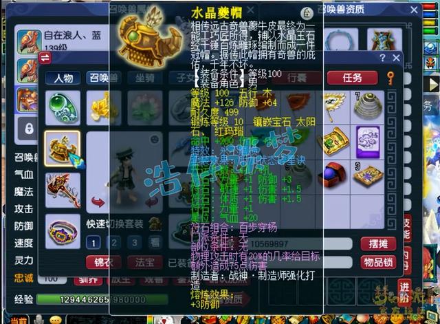 Hello大家好,我是浩仔!关注浩仔,每天给你带来最新梦幻西游游戏资讯!以下点评仅代表个人意见,不代表官方或平台立场。不知从何时起,物暴凌波城开始非常流行。主要还是得益于他的门派特色,自带1%物理暴击几率,而且神器能增加物暴等级,灵饰再多几条物理暴击等级,变一张必杀卡比较容易做到100%暴击。之前给大家展示过了175级的百暴凌波城,今天就给大家展示一个129级的物暴凌波城。作为一个物理系,尤其是喜欢刷任务的物理系。没有一把永不磨损武器是非常难受的,耐久掉的心疼。本篇文章要展示的这个129级凌波城,他不但带永不磨损武器,甚至其他5个部位都是永不磨损,可能属性不是最极品,但是让人看起来很享受,刷任务也非常舒服。而且他的宝宝也很有亮点,都是129级受追捧的,一起来看看吧!