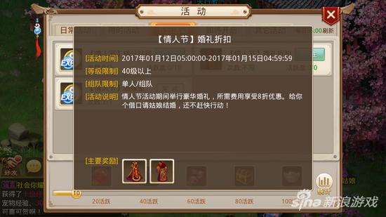 这次情人节活动分为个任务,分别是单人完成的“姻缘签”多人组队的“缘分结局”和一个豪华婚礼打折活动。