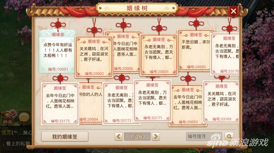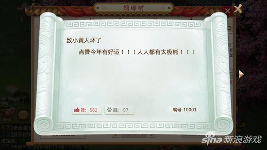 当然只是写完了还不算玩,只是写完是拿不到奖励的,还需要对其他人的姻缘签点赞,玩家才能获得奖励,下图就是其他人的姻缘签所在的姻缘树的界面。从图上可以看出来,竹质和玉质确实比免费的纸制要显眼多了。