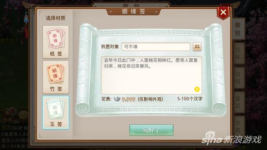 在领了这个任务后月老首先要玩家先写下一个姻缘签。而且这个姻缘签居然分了级别,分为纸质,竹质和玉质,而且后2种需要元宝才能用,竹质999元宝,玉质9999元宝,下图是玉质的姻缘签。