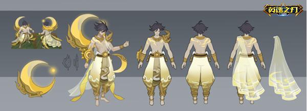 主题系列皮肤"瑶月澄心"都是以"月"为核心设计灵感,这种意象源于人们心情舒朗遥望明月所得,但这种意象与情绪太过抽象。不过,结合《岳阳楼记》的"皓月千里,浮光跃金",与民间传统工艺鎏金技术,让这款皮肤拥有了具象化的可能,并最终为玩家呈现一位爽朗大气的少年形象。因此,鎏光的配色以金、黄、白为主,但色彩的饱和度大大降低,令造型整体气质不落平庸,展现出一种张扬华贵却不老土的气质。在服饰的设计上,这款皮肤依旧结合人物剧情——鎏光在故事中与颐光是兄弟,且扮演的角色与颐光相对,他是仙祝的"明卫"。所以服饰的设计在参考颐光的基础上重新设计,重点以装饰物,后背月轮、纹饰等展现庄重感,和某种仪式感。但为了突显鎏光性格中的轻盈与活泼,设计师故选择了轻纱作为披风的材质。