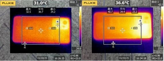 OPPO Reno7 Pro的内部中框五金部分还做了隔断设计,玩游戏不烫手。笔者在游玩了30分钟《和平精英》后,机身背面温度平均仅36.6℃,最高温度40.7℃,相比闲置时温度仅上升了5.6℃,手指碰触的区域温度仅有34.4℃,完全没有烫手的感觉,散热能力非常出众。