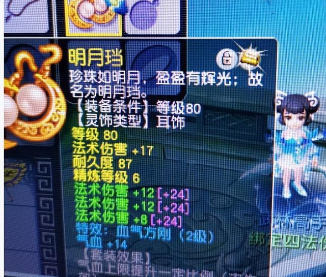 这个耳饰别看是80级的,那属性可真的暴力啊。这样的装备居然才镶嵌6级星辉石。主属性加了17点法伤,下排全部法伤。而且重点是2条都是加12点,这可是爆了很多呢。特效是2级的血气,也太差劲了点。
