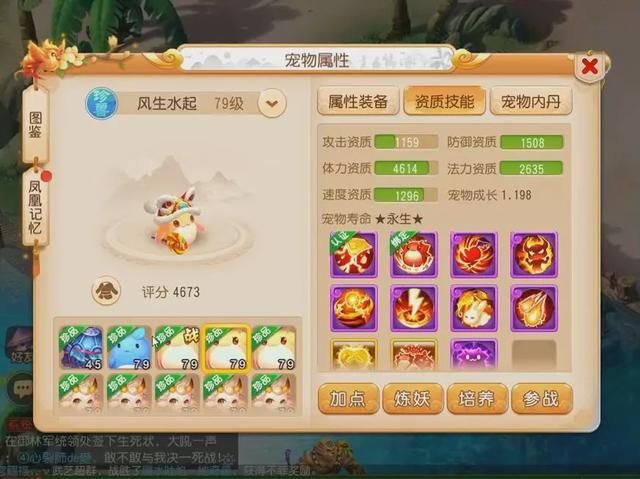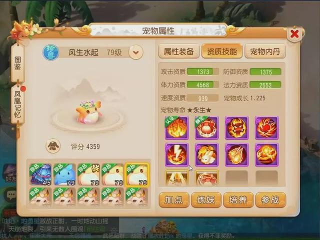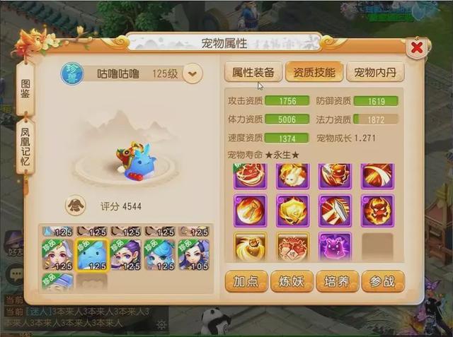 第四只是8技能的群法吉里吉里,宠物成长1.225也相当高,同时法力资质2552超过了吉里吉里的最高资质,防御资质1375离最高资质也只差5点,同样是一只能打能抗的宠物。