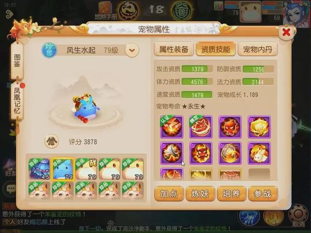 首先是一只9技能配速血宠咕噜咕噜,由于咕噜咕噜本身的特殊技能是被法术攻击时有几率不受伤害,因此作为配速宠物是非常合适的。这只咕噜咕噜的宠物成长1.189是高于最高初始成长1.18的,同时速度资质1479也超过了宠物的最高资质1380。而不错的体力资质4576和防御资质1256,配合高级招架、高级强壮、高级防御使得这只宠物的生存能力大大增强。值得一提的是,这只宠物还带有高级精神集中,可以抵御封类异常状态,这样可以保证在我方劣势的时候,这只宠物能够站得住,并在每回合第一个出手拉人。