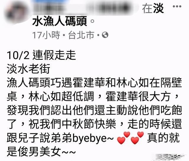 9月3日,有网友发文称遇见了霍建华林心如夫妇在淡水渔人码头吃饭,并拍下了图,从图上可以看出,霍建华、林心如两人都戴着帽子,显得十分低调随和。