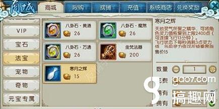 在“商城”打开,选择“法宝”最后一页就能看到了,价格是15绑定元宝一个,不是很贵,但是为这类道具,除非是风景党,一般来说没什么用。
