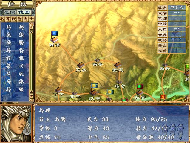 第三个剧本-群雄割据,周围空地多的君主有马腾、刘璋、张鲁、孙策、王朗、士燮、刘表。这次推荐选马腾,因为马超和庞德出来了,并且没有和敌方交界的城池,不用担心被攻打。其他像刘表、孙策,都有城池挨着敌方在。