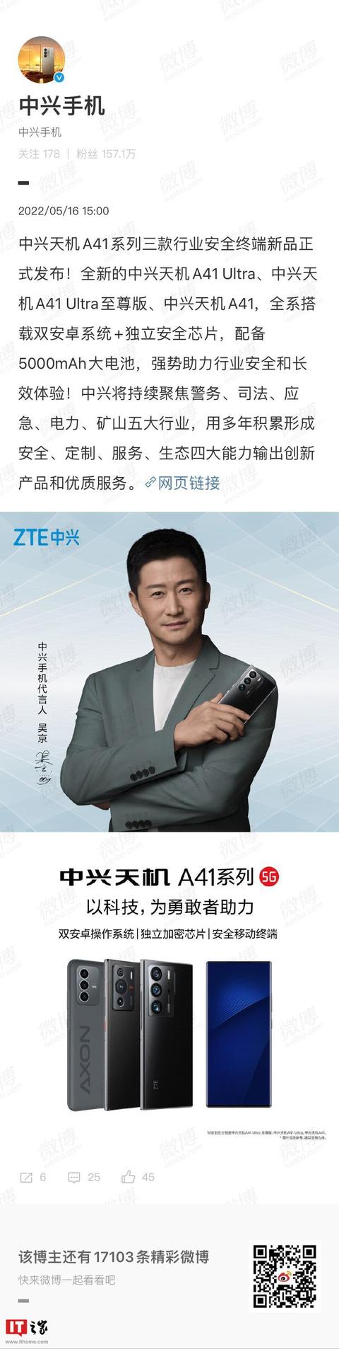 IT之家 5 月 16 日消息,5 月 16 日,中兴官方宣布,中兴天机 A41 系列三款行业安全终端新品正式发布!全新的中兴天机 A41 Ultra、中兴天机 A41 Ultra 至尊版、中兴天机 A41,全系搭载双安卓系统 + 独立安全芯片,配备 5000mAh 大电池。
