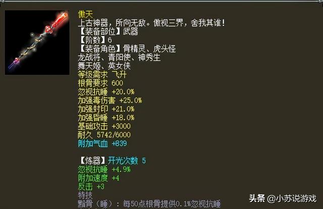 最后咱们要说的是一件忽视睡的6阶仙器,按照平常的玩法,大家打造睡属性时都会选择4阶仙器。而图中这把6阶女人族仙器不仅各项属性趋于完美,而且在保证了属性的同时还可以兼顾毒法伤害!以前的版本里女人族毒法和睡法比较出冲突(毒法第二回合可以毒醒单位),不过近期《大话西游2》的开发组已经更改了这一设定,那么以后是否会出现这种兼顾毒和睡的新战术呢?