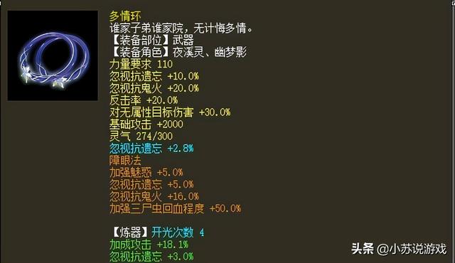 先来看一个不太常见的武器,图中这件装备目前已经停止投放了,也就是大家常说的绝版属性。它的亮点就在于蓝字高忽视遗忘以及原始拥有的忽视属性。(新版武器都是强法属性)算上神兵石以及开光炼器,整体忽视遗忘20以上,可能有朋友们对于这个数据没有太清晰的概念,换个说法大家会更容易理解。作为控制系法术。“冰、混、睡、忘”四种法术的忽视都差不多,也就是说这件神兵相当于一把忽视混20+的武器,并且还没有属性要求,这一下各位感觉如何,是不是很强大?