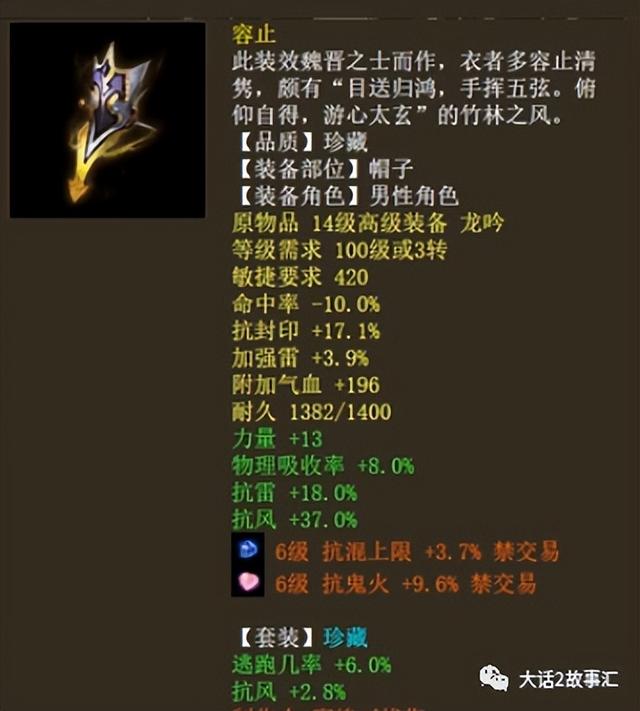 帽子的底子是抗封印17.1,炼化效果抗物理加8,抗雷加18,抗风加37,套装绿字抗风加2.8.