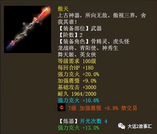 首先是他的武器,2阶仙器,强力克火家20,加强震慑9,蓝字是强力克火家10.6,炼器是强力克火家13,打了7级宝石加强震慑8.8,还是很普通的一把抽魔武器。