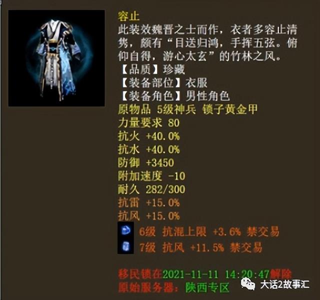 衣服是5级身边锁子黄金甲,抗火加40,抗水加40,抗雷加15,抗风加15,打了7级的宝石抗风加11.5,玩家对于仙法和控制法术的抗性堆的还是很卖力的,不过整体看起来不是特别值钱。接下来咱们就来看看他这一身价最大的卖点吧。