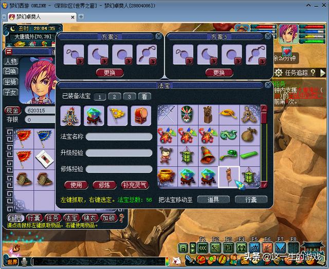 没改之前的钓鱼是第一暴利休闲任务,现在又有多人知道做过呢,梦幻赚钱的永远是冷门活动,现在的刷子只知道一味的刷刷刷,日常真的是最拉的了。其次就是卡法宝任务,只要把那些垃圾法宝扔法宝扔法宝栏就可以接值钱的不停的做就可以,五开师门做完法宝最少能做出来300万,下图是我队长的卡法宝做出来法宝就扔仓库,升级了惊魂铃,神行飞剑被我卖了。