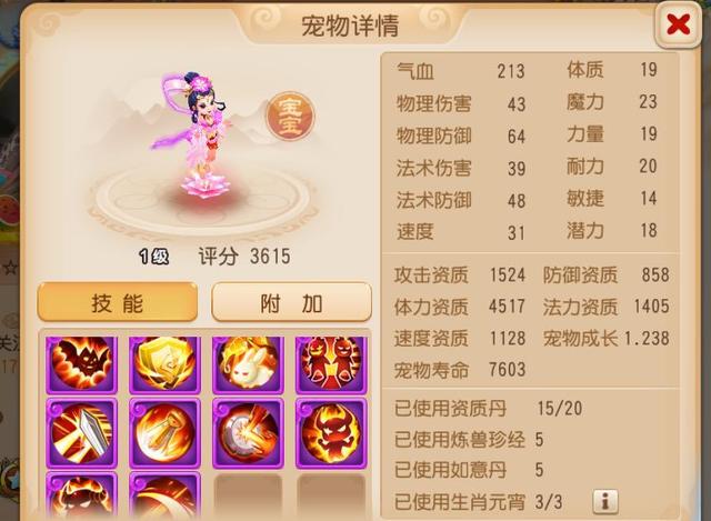 可以看到,这只芙蓉仙子的资质非常优秀,攻击资质1524与满值只差几十点,体力资质4517也很不错,搭配上1.238的成长值,整体属性出色!