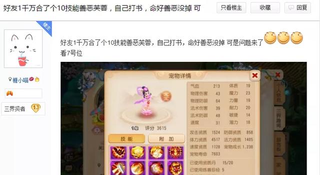 这只宠物说来可就有意思了,这名玩家的朋友在前两天花费巨资合了一手芙蓉,运气还不错,成功的合出一只10技能善恶芙蓉仙子胚子,并且在打书过程中也比较顺利,没花费太多金币就打成了全红。眼看打造出了极品善恶宠,但号主并不开心,这是怎么回事呢?