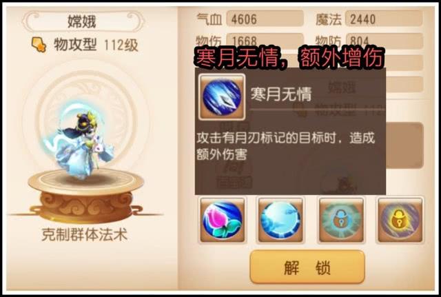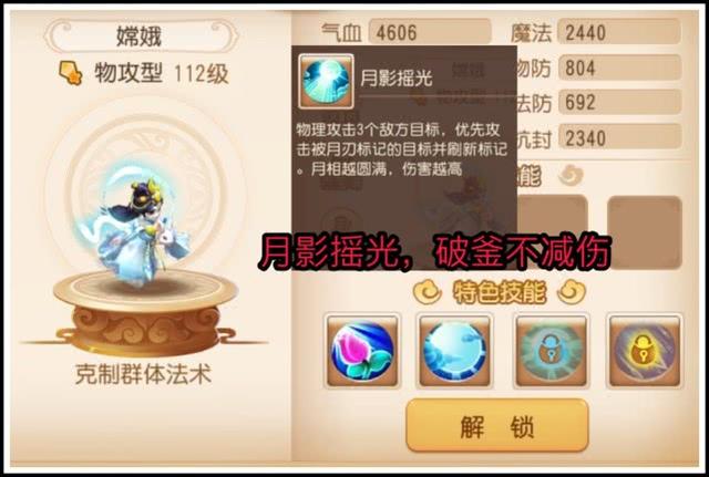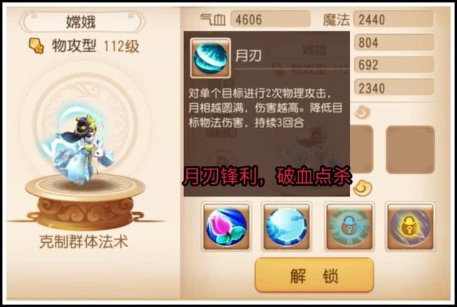 首要精通技能[月刃],对单个目标进行2次物理攻击,月相越圆满,伤害越高。降低目标物法伤害,持续3回合,一个活生生的技能版破血,当然实用性还是比较强的。同时技能[月影摇光]物理攻击3个敌方目标。月相越圆满,伤害越高,无疑是一个加强版的破釜沉舟,真的是女中豪杰呀,不比大唐程咬金差。