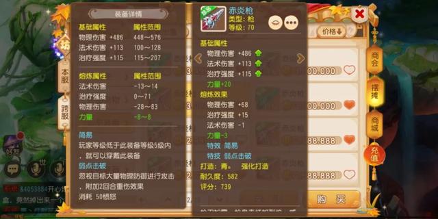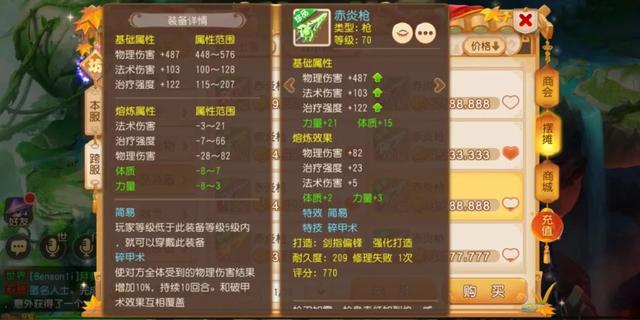 第一把武器是70级简易赤炎枪,虽然479的基础物理伤害属性低了点,但熔炼属性和绿字双加属性还不错,所以整体属性加成还可以。并且这件武器还是一件罕见的双蓝字武器,特技方面是魔兽之印,可以提高全体队员15%的物理伤害结果,非常实用,目前在摆摊商城中的售价是499W金币。