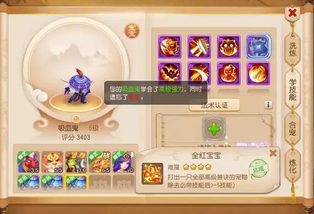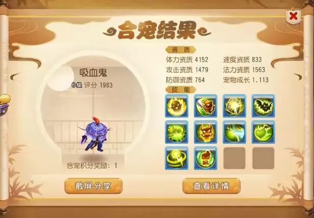 合宠点下去以后,刷刷刷地出了合宠专家难度二星、三星和四星的成就,看来号主成功地合出了10技能的吸血鬼!那么最终的资质成长情况如何呢?