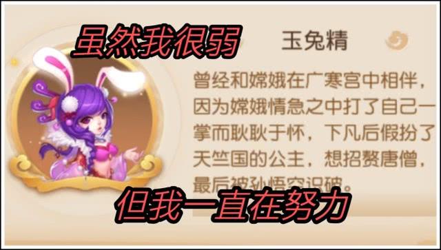 玉兔精在《西游记》中原为广寒宫中捣药的玉兔,因为和嫦娥小姐姐闹了点矛盾,所以溜出宫门,逃至下界,假扮天竺国的公主戏哄国王。玉兔精算好唐僧路过天竺国的日子,抛绣球,砸到唐僧一行,想要“白嫖”唐僧 最后被悟空识破。而在《梦幻西游手游》中和嫦娥都属于月宫封系助战,高冷是一贯的特性。