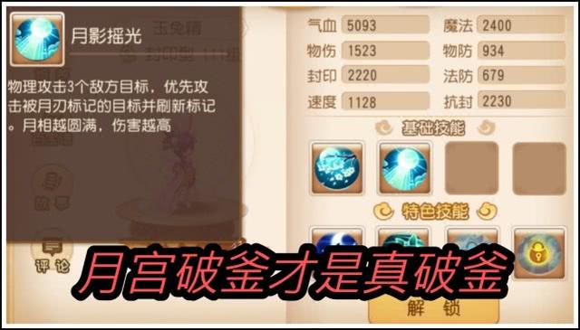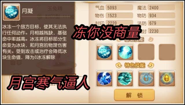 可能是月宫太冷的原因,[月凝]的功效,首先是冰冻一个敌方目标,使其无法执行任何动作,请注意这里是任何动作,这一点来说控制效果还是满强的。其次在月相越残缺的时候,基础的命中率则会越高。冰冻的作用将命中的目标一部分生命变为冰块,变成冰块的血量多少则和我们的兔女郎-玉兔精的物理伤害有关。被冰冻的目标在受到攻击或治疗时,则会降低冰块生命值,当冰块的生命值降为0后则冰冻解除,恢复正常状态,不过曾经被冻住的血条则无法弥补!除了[月凝]之外,技能[月影摇光]她也比较擅长,物理攻击3个敌方目标。