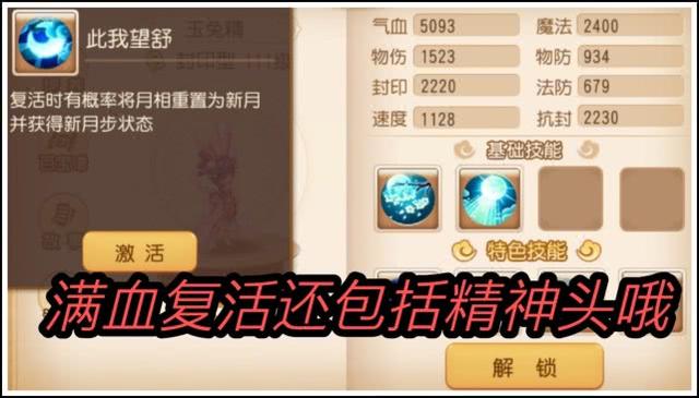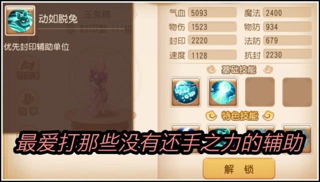 虽然本身素质条件并不好,但是在培养天脉后可大幅度提升封印命中、速度,激活天脉技能后还可以在月凝命中单位后增加封印命中,一般玉兔精在五层命中的时候还是比较准的。培养地脉后可提升气血、物防、法防、抗封,激活地脉技能后还可以在死亡后有概率重置月相为新月,并获得新月步状态,死亡后有概率提升自身的封印命中和速度。虽然培养后有BUFF加成,但是总体实力在助战中还是偏低,所以并不建议大家花大力气去培养,毕竟有那么多的强力封系。
