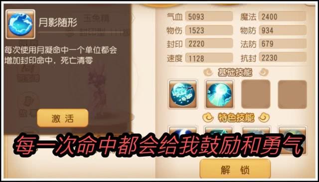 从整体属性来看都是不占优势的,其实这一点小九就很疑惑,明明是一一只小兔子,按照道理来讲,敏捷速度应该是长处才对,结果在封系助战中速度居然也排不上前列,总体来说属性上并没有任何优势。那么我们再来看一看她的技能,可能是因为在月宫的原因,她的基础技能是[月凝]。