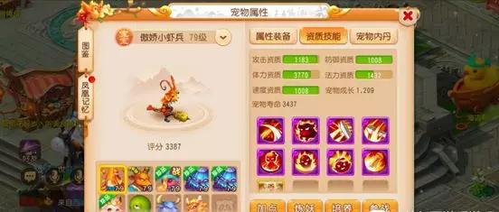 第二只个性宠物是一只10技能的隐攻虾兵,这只宠物的初始资质同样不是很出色,用来打造合宠难度非常高。但这名玩家再次证明了只要爱得够深就能够拯救一切,他所打造的这只虾兵在属性方面不仅拥有1183的攻击资质、1008的防御资质、3770的体力资质,还有1.209的高成长值,非常优秀。在技能配置方面,这只虾兵也是极为豪华,除了大量增加伤害的技能外,还有高级反击、高级鬼魂来提升这只宠物的生存能力,实用性非常强。