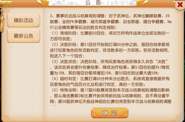 随着赛事不断的升级,同时也对战斗规则进行了不断优化。在本周更新后,对于武神坛、武神坛巅峰联赛、X9联赛、全民PK争霸赛、城市英雄争霸赛、剑会群雄、擂台争霸赛、NeXT公会精英赛等玩法的胜负判定规则进行了调整,在比赛前50回合,如果将己方所有作战单位全部击败的一方即可获胜;而在50回合之后,在战斗中进行至60分钟之间,每回合都根据玩家角色的存活数判定,存活较多的一方获胜。而若是在比赛打满60分钟后仍未分出胜负,则将直接根据所有玩家角色的气血百分比总和来判定,由最高的一方获胜。并且在决胜阶段所有玩家都将获得“决胜”状态,提升自身伤害结果、降低治疗效果,喜爱参加竞技赛事的小伙伴可要注意新玩法判定规则哦。