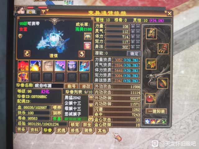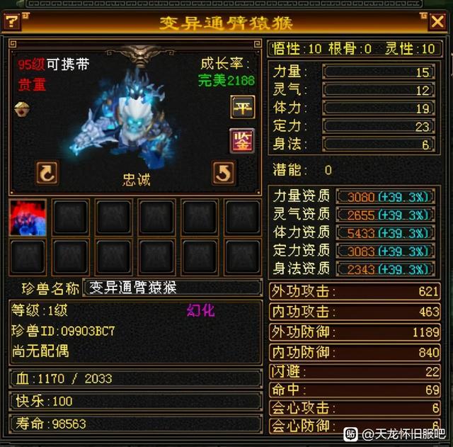来自【唯我独尊】服务器的老铁,生了一只2900+裸资质的7变通臂猿猴,作为超灵体力宝宝,提升悟性10灵性10之后,资质直达5449!