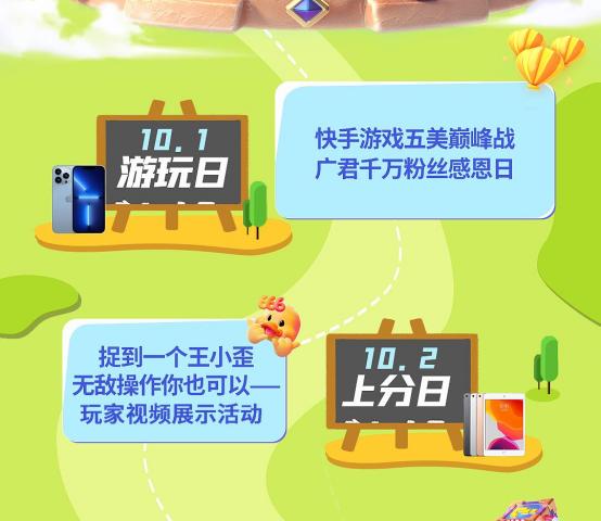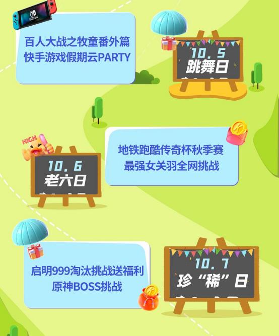 还有人气超高的快手主播们,这次也在国庆期间准备了精彩的假期直播送福利活动,快手游戏五美巅峰战、主播千万粉丝回馈、黄金风衣狙击战、金牌上分天团、大师对挑挑战等等。只要打开快手游戏人的假期日常,就可以跟着一起嗨翻天,快来参与吧。