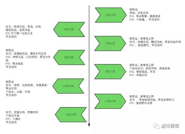 游戏上线后的内容运营上,《倩女》保持了1个月1个大版本的节奏,下图简单描述了在上线后的内容发布情况: