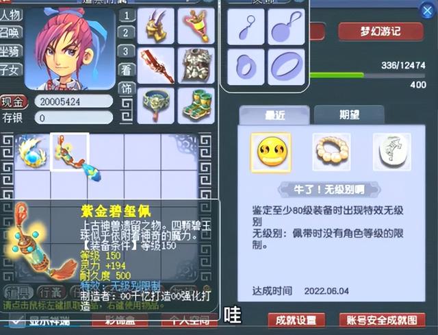苦难在端午节接了一批资源,要鉴定90件装备。他在点第一件150级项链时,弹出了“牛了!无级别”成就。这波是妥妥的一发入魂,开局就是巅峰!这条项链初灵194,属性不算太高,不过带上梦想蓝字,它的价格肯定能到6位数。