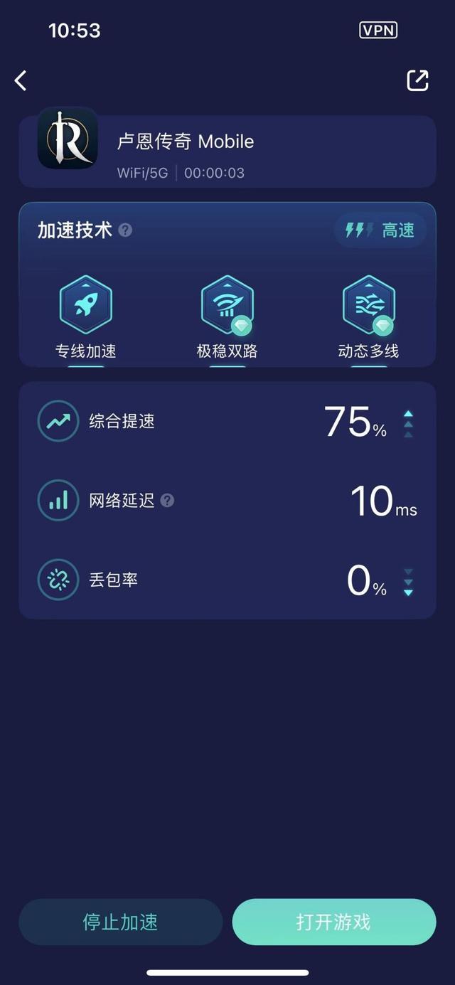 在WIFI与移动网络中双路同时加速,并判断最优线路连接,保证游戏时网络波动在最小范围,且不受切换网络时影响。