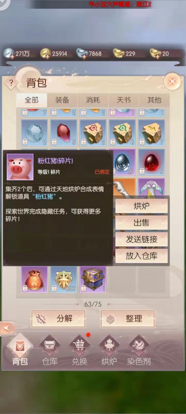 获得“粉红猪”碎片,两个粉红猪碎片就能够在天地烘炉里合成成为“粉红猪”道具。