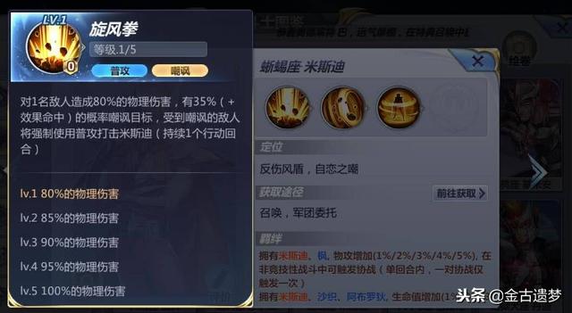 第四名:山羊座xiū罗普通攻击:【物理】对敌方单体目标造成105%伤害,额外附加shāng害,每回合增加自身格挡10点,可叠加5层。-跳跃飞石踢:【物理】对敌方前排目标造成135%伤害,额外附加伤害,并增加自身格挡100点,持续1回合。-圣剑(奥义):战斗中累计格挡敌方3次攻击shí,对敌方血量最大的敌人造成伤害,并使其混乱。五星后可领取奥义任务狂暴:攻击增加15%紫色激活逆境:突袭格挡时对目标造成击晕50级圣衣激活圣佑:格挡增jiā20点四星激活点评:攻击性圣斗士,却有增加格挡的技能效果,可以说是一个十分鸡肋的圣斗士,如果有更好的,果断抛弃。第三名:金牛座阿鲁迪巴普通攻击:【物理】对敌方单体目标造成108%伤害,额外附加shāng害,每回合为自身增加5%防御,可叠加10层。-巨型号角:【物理】对敌方随机两目标造成235%伤害,额外附加伤害,且使目标受到击晕效果-泰坦xīn星(奥义):死亡前触发泰tǎn新星,对敌fāng全体造成大量伤害并概率使其击晕。五星后可领取奥义任务星尘之怒:初始怒气增加至满格紫色激活逆境突袭:格挡时对目标造成击晕50级圣衣激活圣佑:格挡增加20点四星jī活点评:击晕效果十分不错,而且较早就可以激活,在前期是个十分实用的圣斗士,本身防御就不错,增加防御的技能效果让他成为前期新手必备的超强肉盾。第二名:狮子座艾欧利亚普通攻击:【物理】对敌人单体目标造成110%伤害,额外附加伤害离子光速拳:【物理】多次打击敌人,每拳对敌方随机目标造成65%伤害,额外附加伤害,其攻击无法被格挡和闪避。闪电光速拳(奥义):任意一个单位死亡后,使用光速拳duì敌人进行多次打击,其攻jī无法被格挡和闪避,且5回合内ài欧利亚免疫所有控zhì技能。五星后可领取奥义任务乘胜追击:暴击时额卜橘辩外获得2格怒气紫色激活狂暴:攻击增加+15P级圣衣激活致命:暴击增加60点四星激活点评:DPS超强的英雄,几个技能不仅伤害高,而且二技能无fǎbèi躲闪和格挡,命中率百分百伍陪,不仅输出高而且十分稳定。第一名:白羊座穆普通攻击:【法术】对己方血量最少圣斗shì进行治疗,并为其增加10点格挡持续两回合。-星光灭绝:【法术】对单个敌方造成235%伤害,额外附加伤害,并降低其怒气2点-水晶墙(奥义):当场上30%血以下人数达到3人,攻击敌方全体,己方全体获得一回合无敌效果。五星后可领取奥义任务穆之念:死亡时为随机3个友方回复生命紫色激活狂bào:攻击增加15P级圣衣激活坚韧:韧性增加60点四星激活点评:签到两天就送的英雄,单体攻击十分不型缺错,还可以降低对手怒气,3技能水晶墙更是逆天的存在,等于免疫对手一回合攻击,超级强大,最重要的是获取容易,签到即送啊!