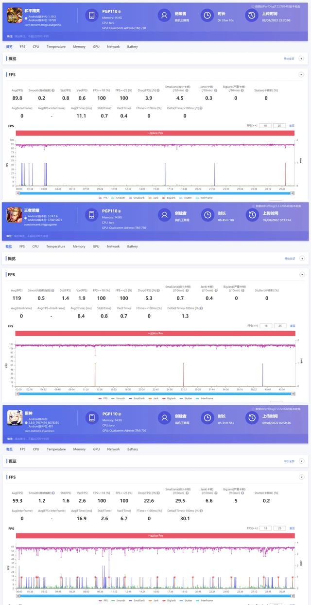 一加Ace Pro出色的游戏表现,也第一时间在许多数码博主的视频中得到了验证。比如博主搞机王腾霄经过和平精英、王者荣耀、原神三轮实测后发现,帧率分别达到了89.9帧、119帧和59.3帧,都是对应游戏的顶级水准,帧率波动幅度非常小。
