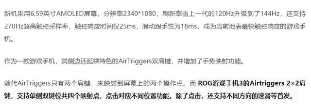 ROG3在软硬件方面相比以往的游戏手机做了不小的升级:支持游戏高帧率高分辨率、加快游戏相应速度跟按键灵敏度、解锁了手势映射、连点速滑等操作!