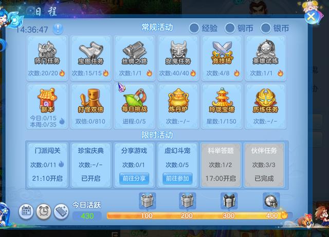 在日程任务中,师门,封妖,捉鬼,都属于低难度任务,虽然捉鬼比较耗时,如果不是队长的话大部分时间都是挂机,所以比较轻松,并没有小伙伴们想象的那么艰难。而竞技场,28星宿,36天罡,则属于有难度的挑战玩法,需要玩家手动操作进行战斗,才能获得胜利,并且拿到更高的收益。所以,萌新小伙伴们还是从头做起,从简到难,相信总有一天大家也能成为大佬哦!