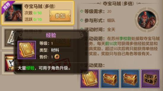 20级可以去完成新的主线任务了。做完20级的主线任务,人物角色等级会达到24级,之后需要30级才可以接取新的主线任务。这个时候,小伙伴们会发现,又有很多支线任务可以去做了。其中比较重要的一个支线任务就是完成25次夺宝马贼任务,夺宝马贼,每天前50次是多倍经验奖励,想要快速升级的小伙伴们,夺宝马贼是每天不能错过的活动。完成夺宝马贼之后,角色等级就会达到25级以上了。