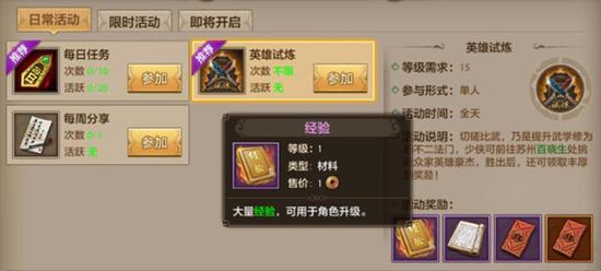 每日任务是玩家等级达到15级以上开启的日常活动之一。任务完成度非常的简单,经验和铜币奖励非常丰富。19级的玩家在没有了主线任务和其他支线任务的前提下,可以参加每日任务来进行升级。完成每日任务和支线任务之后。人物等级就可以提升到20级了,并且会获得英雄拜帖的奖励,使用后,可以结识到新的英雄角色,增加属性和战斗力。