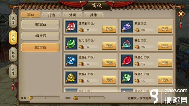 血精石可以通过绑定元宝购买,或者通过有关任务来获取。开头的一些主线、支线任务可以获得一些绿色血精石(1级)和两个蓝色血精石(3级),但这些完全就是杯水车薪。不同等级的血精石差距很大,低等级血精石往往不能满足我们的需求,这种情形下就要装备高级一点的血精石了。升级之后开启的玲珑棋局活动可以获得一些血精石,是最具性价比的获得途径。如果不能满足需求,可以到商城中购买血精石,只要花费一定量的绑定元宝就可以购买,3级的血精石只要125个绑定元宝就能获得,所以还是比较实惠的。最好给能装备血精石的装备都配上3级血精石,并且进行一定的升级。值得一提的是,升级也可以通过绑定元宝进行,所以升一下级是完全可以的。