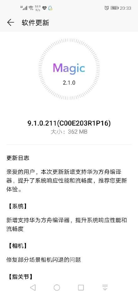 据微博网友反馈,目前,荣耀V20已经收到了Magic 2.1.0新版系统的推送。更新日志显示,本次更新新增支持华为方舟编译器,提升了系统响应性能和流畅度,推荐更新体验。