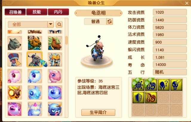 再看海底迷宫,只有虾兵蟹将龟丞相三种。明显虾兵蟹将都是攻宠,龟丞相则是会秒三宝宝的最低等级,同时看资质也能当血宠,5820体资有吸收有防御。